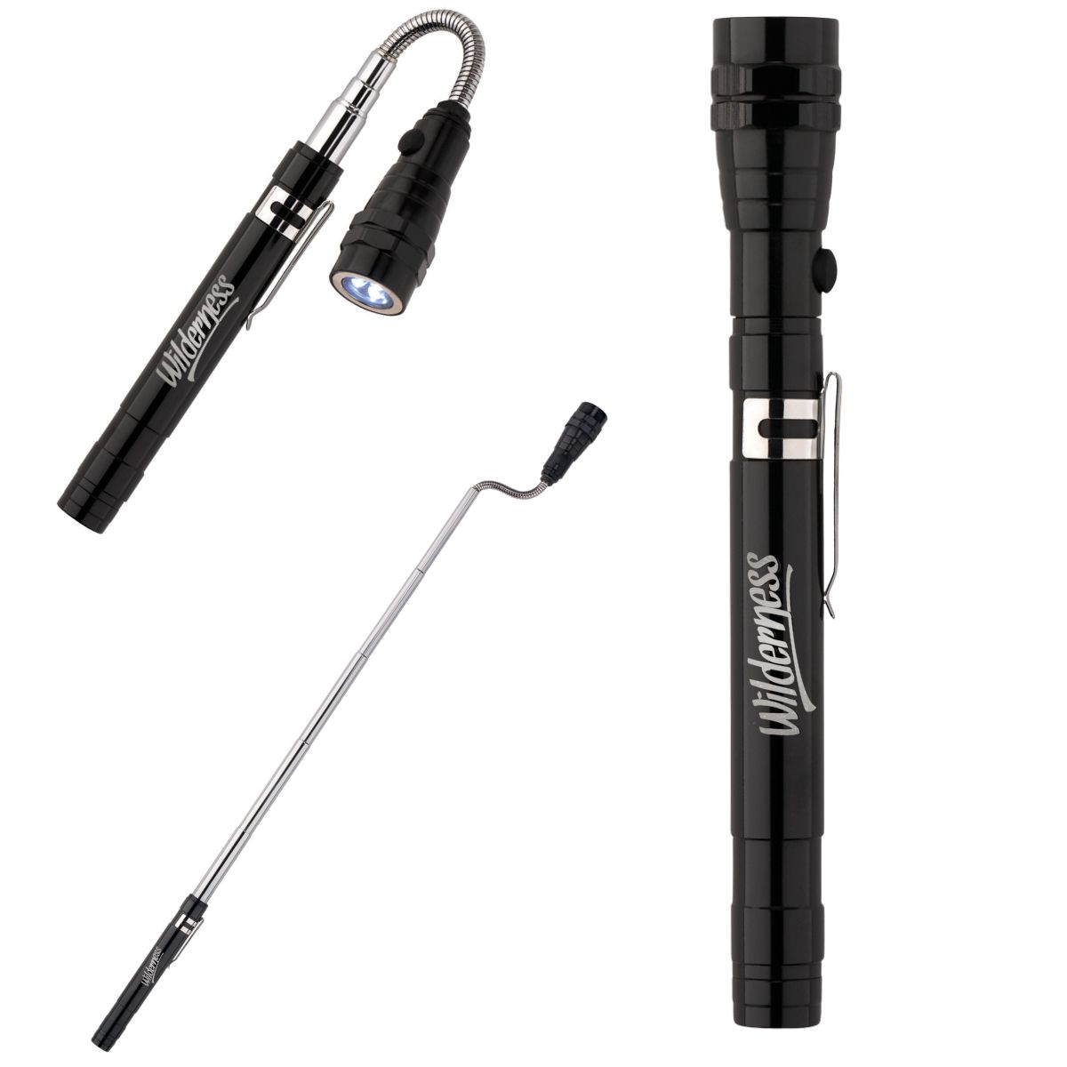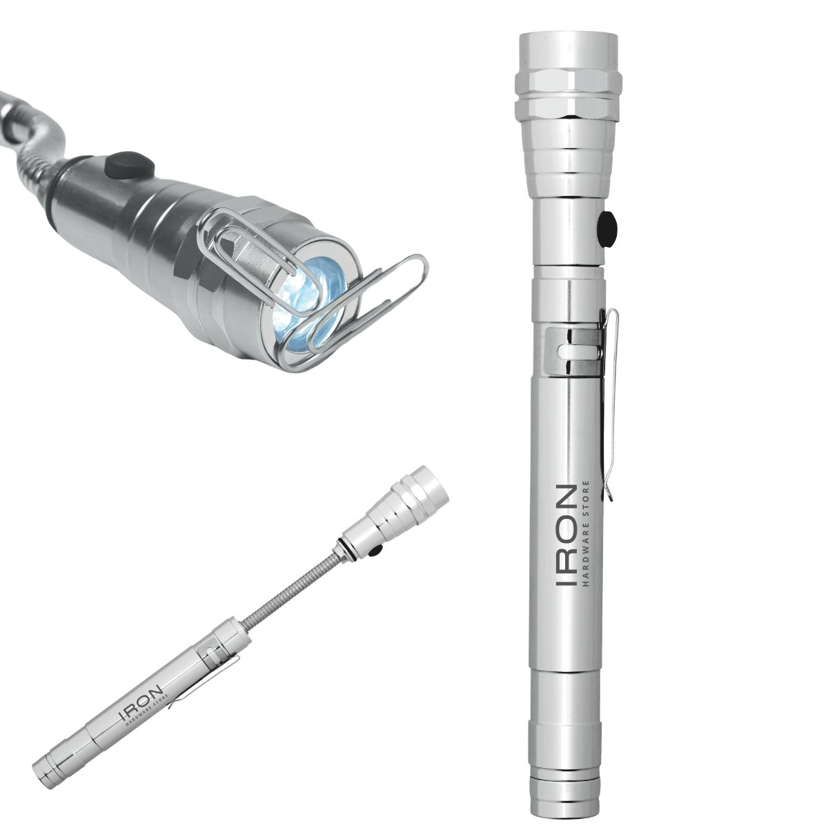 The Stretch Torch is manufactured of aluminum. This torch features an extendable handle, ideal for lighting up those hard to reach places. It can extend up to 57cm. It offers 3 LED light settings, a magnet on the top and a useful clip on the side. The torch is battery operated, using 4 LR44 batteries (batteries included).