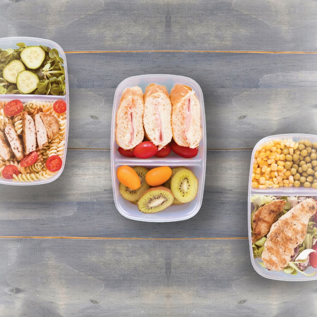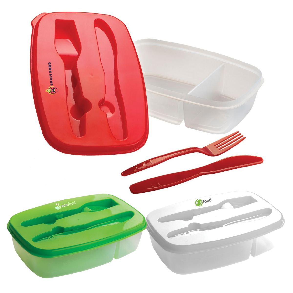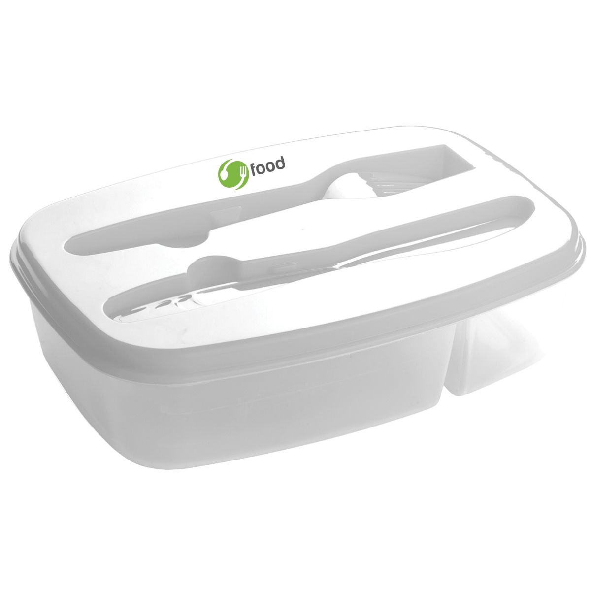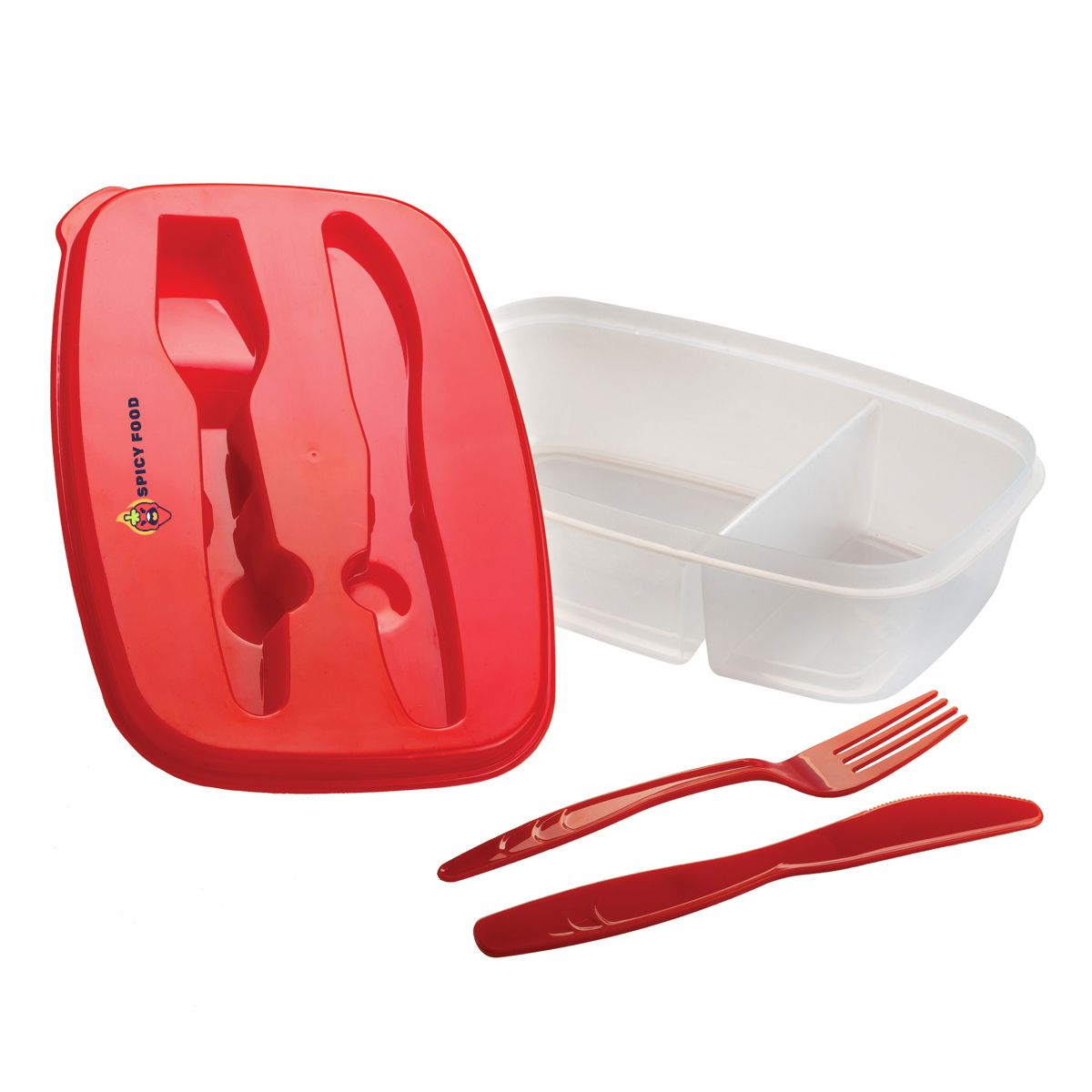 The 2 Section Food Container is the ultimate lunch time necessity. Manufactured using PP Plastic, this container offers a larger storage compartment as well as a separate, smaller storage compartment for dividing and storing your refreshments. This item includes a plastic knife and fork that securely fits into the molded lid, when not in use. *Please note that this product is not microwave or dishwasher safe*
