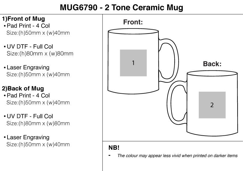 The 2 Tone Ceramic Mug is a beautiful mug, manufactured of ceramic. The outer appearance of the mug has a vibrant, full-colour glossy finish and the inside has a white finish. The mug can comfortably accommodate up to 300ml of liquid. *Please note that this product is not microwave or dishwasher safe*