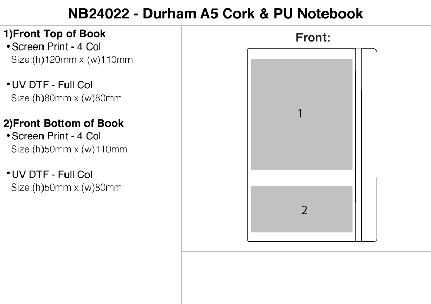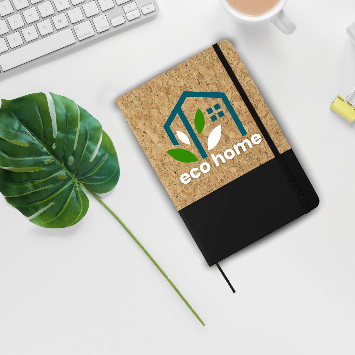 The Durham A5 Cork & PU Notebook is manufactured from a cork upper and a stylish black PU bottom. The notebook offers 80 lined pages, a stylish black elastic closure, a matching black, satin bookmark string as well as a black pen storage loop.