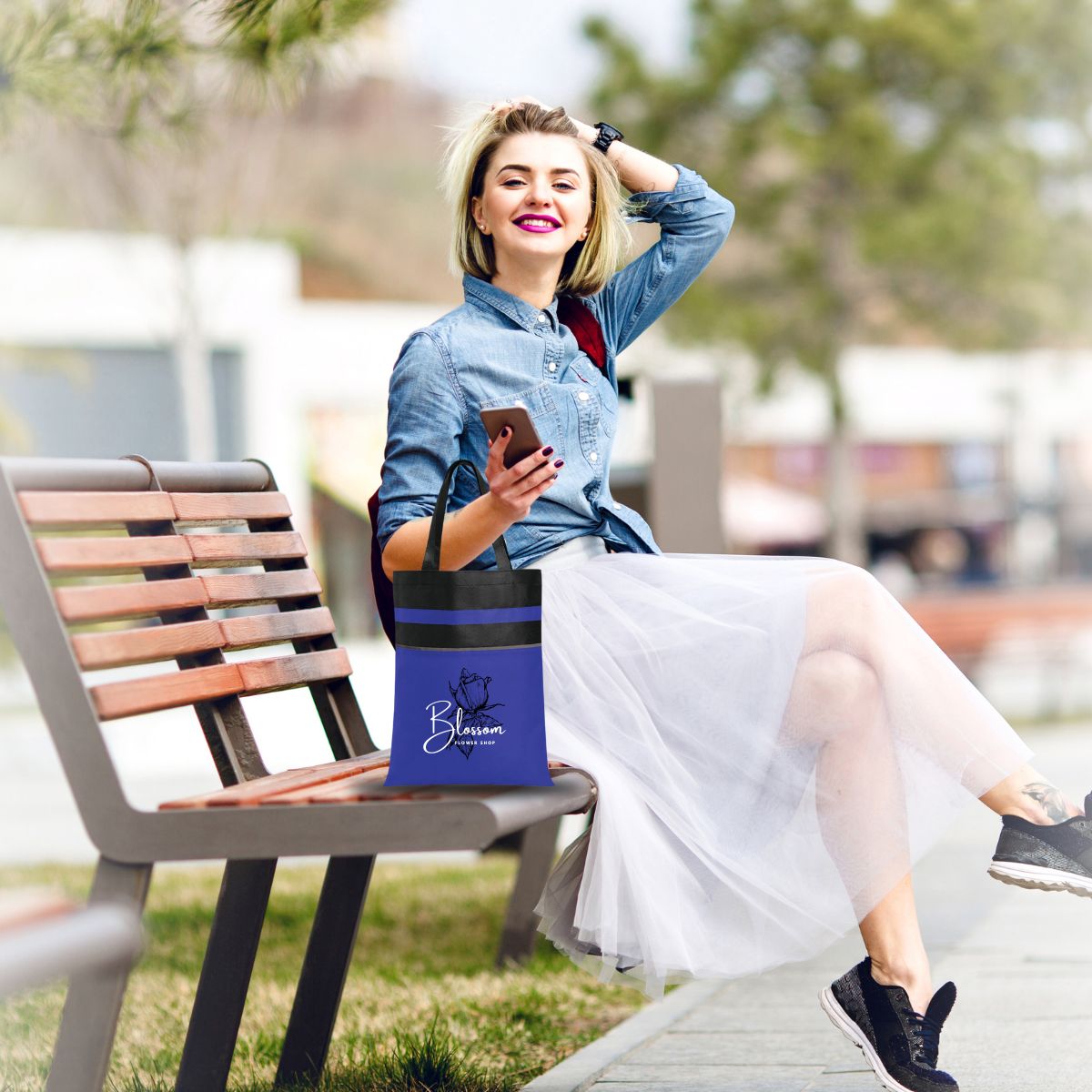 The Lami Non-Woven Tote Bag is manufactured from high-quality non-woven material. It features two sturdy handles for easy carrying, a large main compartment, and a front, reflective strip, enhancing visibility in low-light conditions.