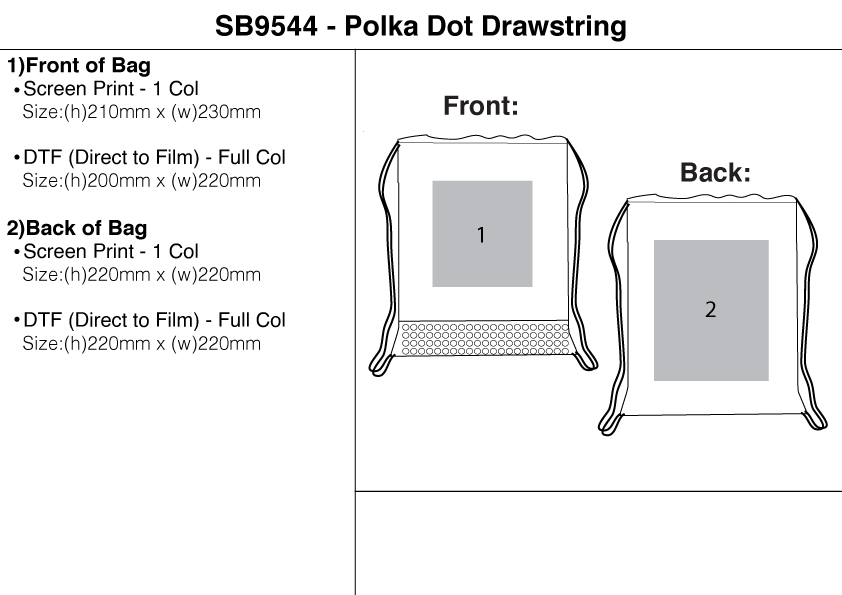 The Polka Dot Drawstring bag is manufactured using 80GSM non-woven material and comes in many vibrant colours. The bag has colour-matching drawstring cord straps for easy carrying as well as reinforced bottom corners for extra security and strength.