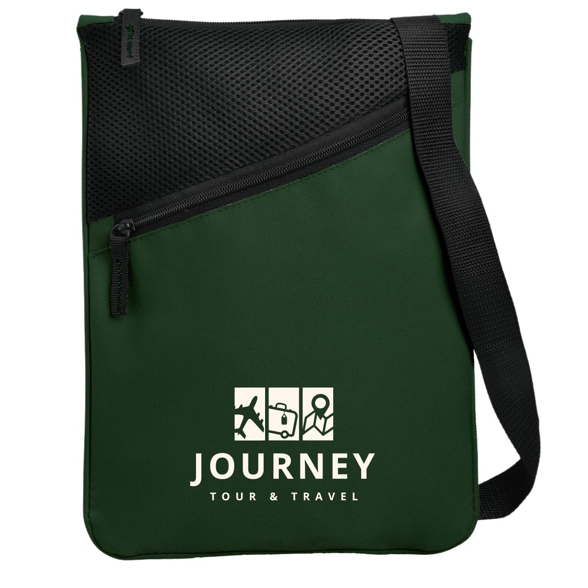 The Madison Messenger Bag is manufactured using 600 Denier material. The bag has a convenient rectangular shape and offers a front, zippered compartment with a mesh finish for additional or “quick access storage. The main compartment is large and zippered. The bag has an adjustable black shoulder strap.