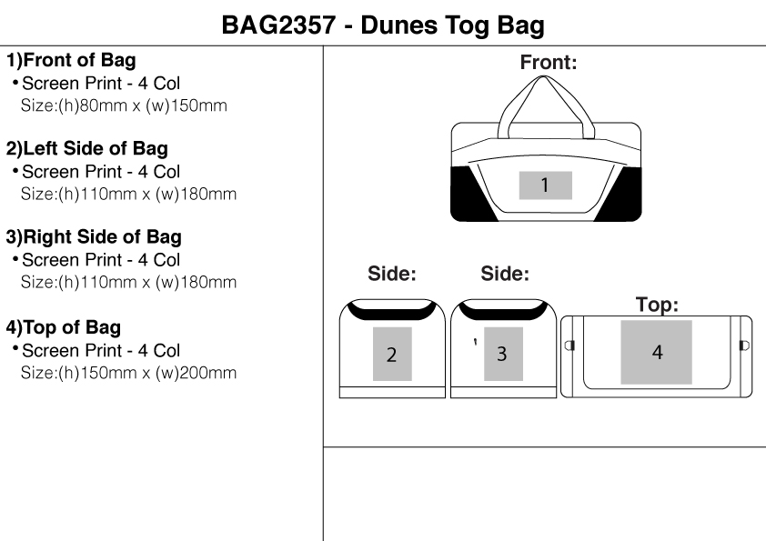 The Dunes Tog Bag is manufactured from 600 Denier material with ample storage and a bold design. The bag features a large, double-zippered main compartment, a large side pocket on either side of the bag, a large, front, zippered compartment, 2 padded carry handles, and a long, adjustable shoulder strap.
