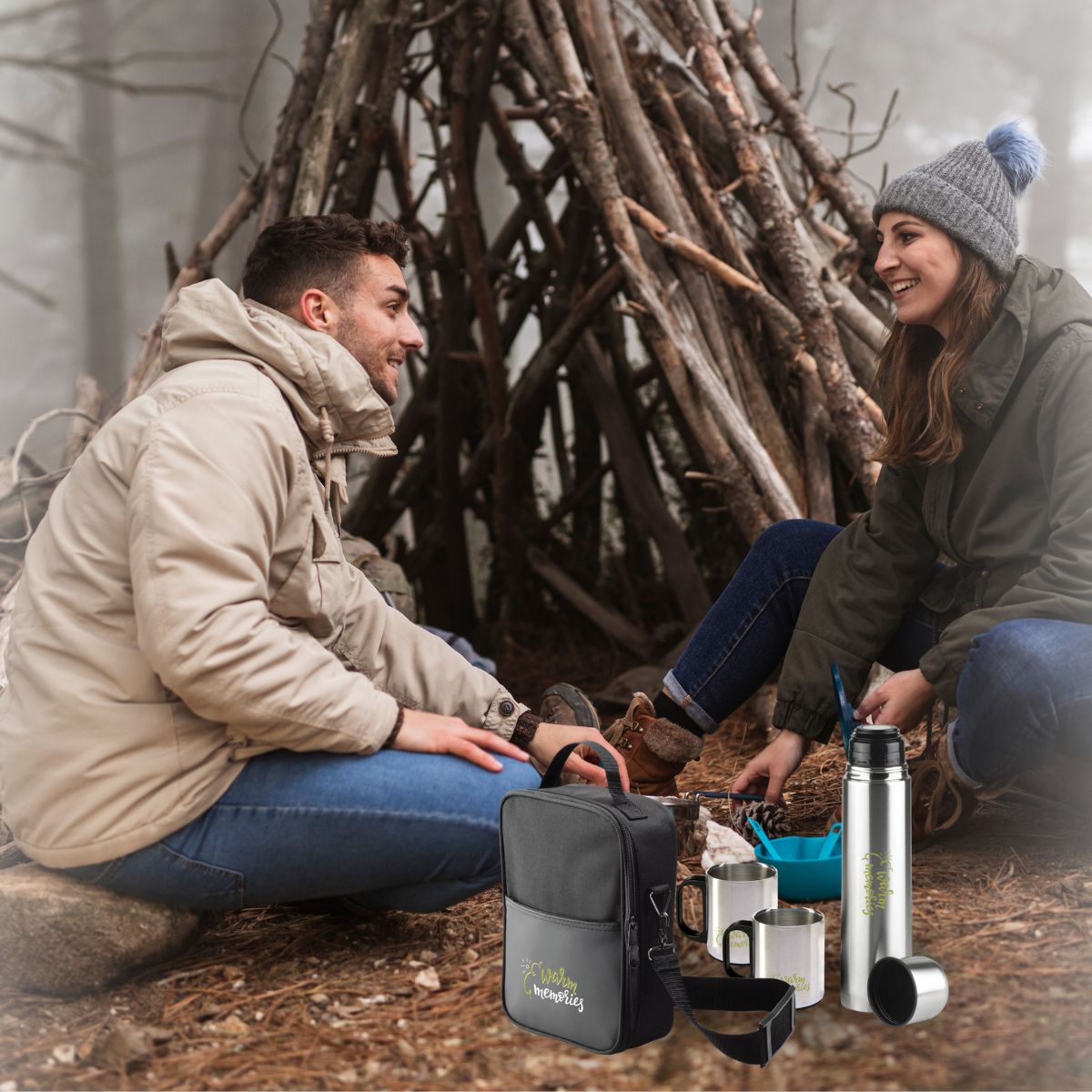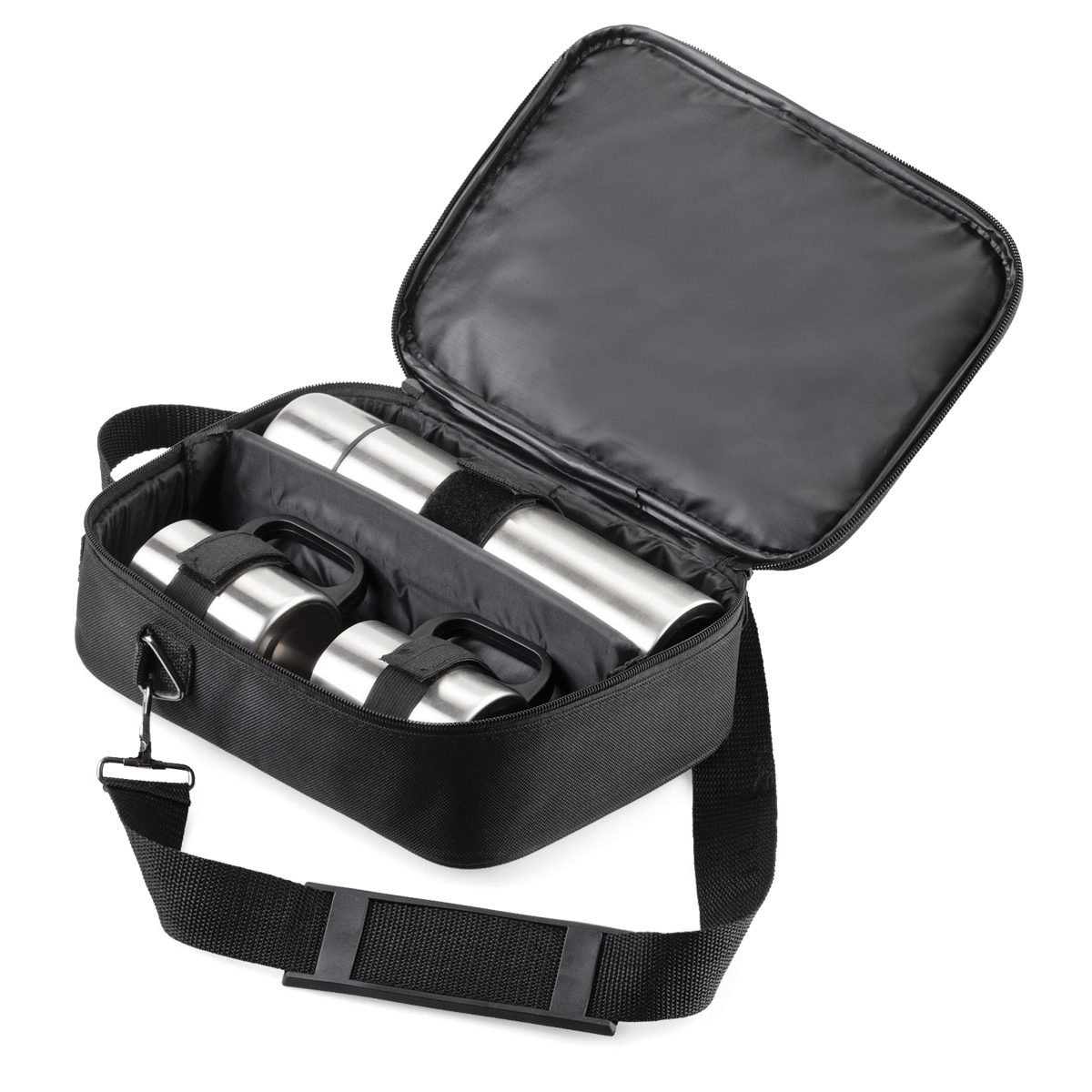 The Ultimate outdoor essential for the adventurous. This flask set includes the following features: 500ml push button thermos stainless steel flask, 2 150ml stainless mugs with EVA plastic handles, and velcro inner straps to keep content secure. This item includes a 600 Denier bag with adjustable straps, zip-around closure, and a front compartment for additional storage. *Please note that this product is not microwave or dishwasher safe*