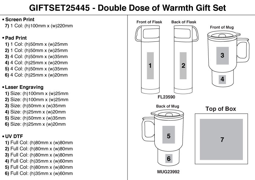 - MUG23992 – Bellini 420ml Travel Mug: Made from premium stainless steel, this 420ml mug features double-wall insulation for effective temperature control and a spill-proof plastic lid. Not microwave or dishwasher safe.