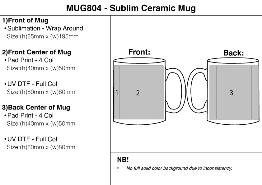 The Sublim Ceramic Mug is a beautiful mug, manufactured of ceramic. The outer appearance of the mug is a white shiny ceramic that has the ability to accommodate a full wrap-around, full color, sublimation print. This is the ideal mug to get your brand out there!!!. The mug has the capacity to hold 330ml. Not suitable for microwave- or dishwasher use.