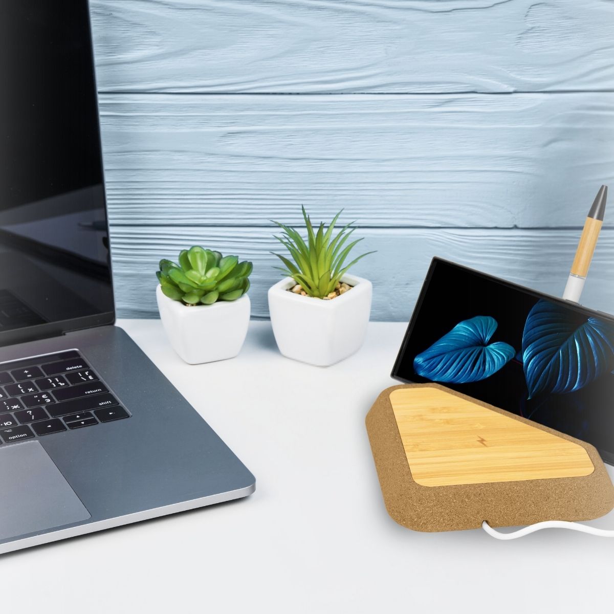 The Benyer Cork Wireless Charger is a fusion of natural elegance and cutting-edge technology. Crafted in natural cork, it is eco-friendly and multifunctional. With a wireless charging surface, you can charge all your technological items that offer wireless compatibilities. In addition to this, there's space to accommodate a pen and a handy cellphone stand.